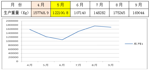 2、產量提升。突破170噸/月,8月份達到175噸,比7月份增產約27噸,9月份與5月份同比增長了38.44%;